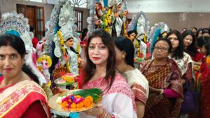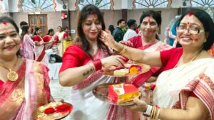 दशहरे के दिन, मां दुर्गा की विदाई से पहले महिलाओं ने सिंदूर खेला की रस्म निभाई, जिसमें उन्होंने एक-दूसरे को सिंदूर लगाकर शक्ति, सौभाग्य और सुख-शांति की कामना की। परंपरागत लाल-बेनारसी साड़ी, शंख की आवाज़ और ढाक की थाप के बीच कार्यक्रम में बंगाली संस्कृति की झलक देखने को मिली। महिलाओं ने मां दुर्गा के चरणों में सिंदूर अर्पित किया और फिर अपने से बड़ों का आशीर्वाद लेकर एक-दूसरे को शुभकामनाएं दीं।