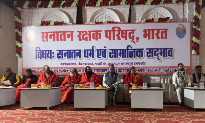 छुटमलपुर (सहारनपुर), 29 दिसंबर 2025: उत्तर प्रदेश के सहारनपुर जिले के छुटमलपुर स्थित देवरत्ना फार्म, रुड़की रोड पर सोमवार को सनातन रक्षक परिषद द्वारा एक महत्वपूर्ण कार्यक्रम का आयोजन किया गया। कार्यक्रम का विषय “सनातन धर्म एवं सामाजिक सद्भाव” रखा गया था, जिसमें सनातन धर्म की रक्षा, सामाजिक उत्थान, सद्भाव और राष्ट्र निर्माण पर गहन चर्चा हुई। यह आयोजन सनातन रक्षक परिषद एवं अखिल भारतीय सनातन परिषद के संयुक्त तत्वावधान में भारतीय स्तर पर सामाजिक दृष्टिकोण को मजबूत करने के उद्देश्य से किया गया।