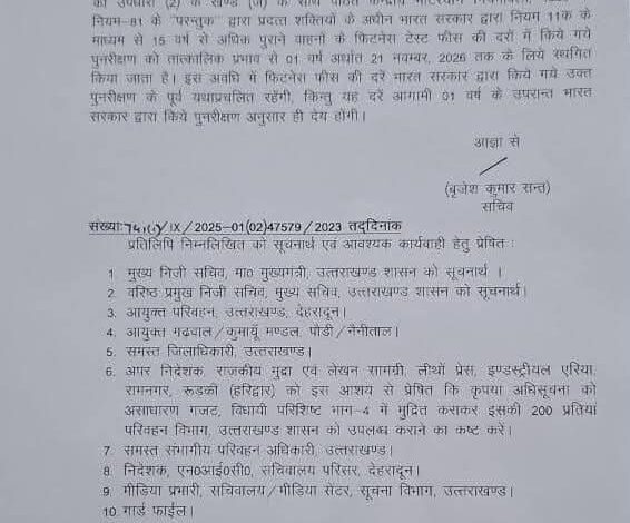 मुख्यमंत्री श्री पुष्कर सिंह धामी के निर्देश पर राज्य सरकार ने उत्तराखंड के वाहन स्वामियों को महत्वपूर्ण राहत प्रदान करते हुए पुराने (15 वर्ष) कमर्शियल वाहनों की फिटनेस फीस में वृद्धि को आगामी 01 जुलाई 2026 तक स्थगित कर दिया है। इस संबंध में परिवहन विभाग द्वारा अधिसूचना जारी कर दी गई है। अधिसूचना सचिव परिवहन श्री बृजेश कुमार संत द्वारा जारी की गई।